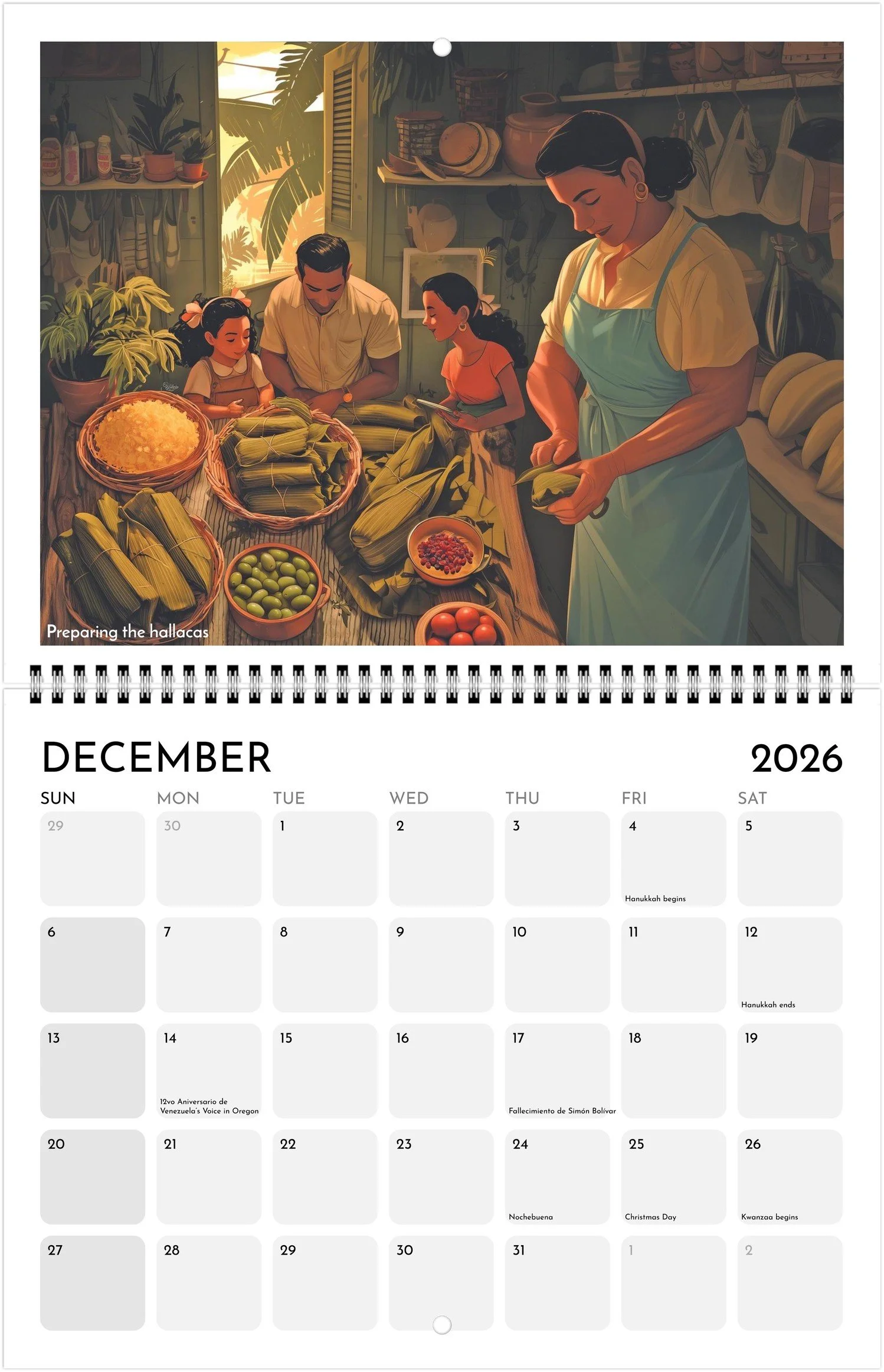 The project began as an experiment in AI-assisted illustration, exploring how generative tools like MidJourney can support storytelling rooted in culture, place, and community. Through a series of stylized illustrations, the calendar imagines moments where Portland landscapes and Venezuelan traditions intersect—from summer beach scenes and soccer culture to December celebrations making hallacas.